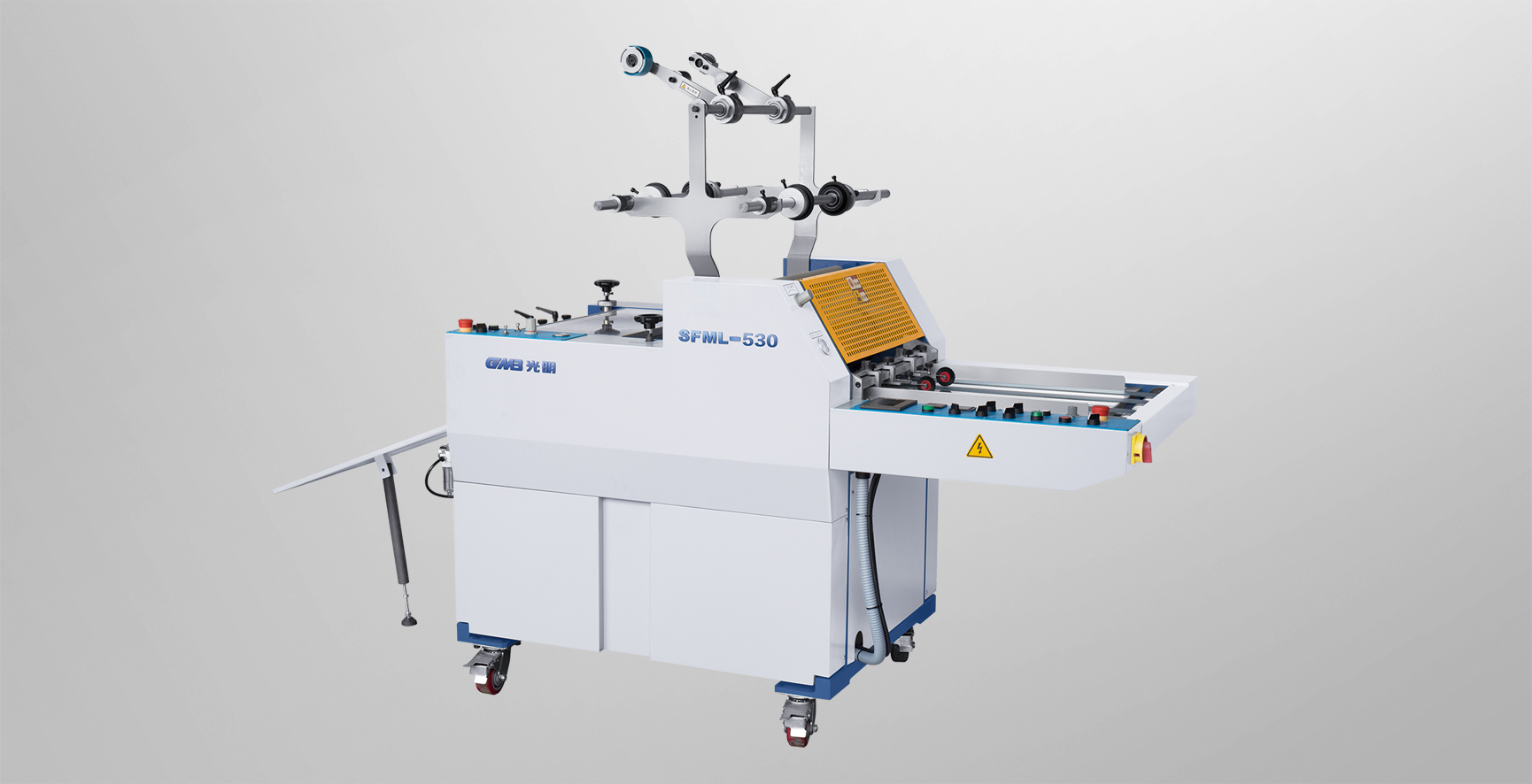 SFML-520B機(jī)型結(jié)構(gòu)緊湊,操作方便,電氣系統(tǒng)由可編程控制器集中控制,彩色觸摸屏,一人即可操作, 用戶只需輸入待加工的紙張尺寸,就能實(shí)現(xiàn)覆膜與分切兩道工藝。